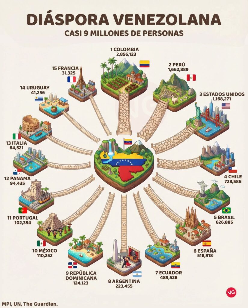 Esta imagen ilustra cómo se ha dispersado la diáspora venezolana por el mundo, con Colombia, Perú y Estados Unidos como principales destinos.