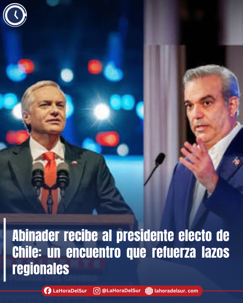 El presidente de la República Dominicana, Luis Abinader, recibió este sábado en Santiago al presidente electo de Chile, José Antonio Kast, en el marco de una gira latinoamericana que el líder chileno realiza antes de asumir el poder el próximo 11 de marzo de 2026. El encuentro, celebrado en la Casa Presidencial de Santiago de los Caballeros, marca un hito en las relaciones bilaterales y proyecta a la República Dominicana como un actor cada vez más relevante en la diplomacia regional.