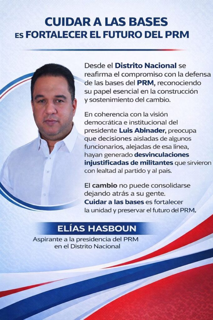 La candidatura de Elías Hasboun se presenta como una opción firme, transparente y profundamente conectada con las raíces del PRM, en un momento en que el fortalecimiento interno del partido es clave para consolidar los logros alcanzados y proyectar nuevas conquistas democráticas.