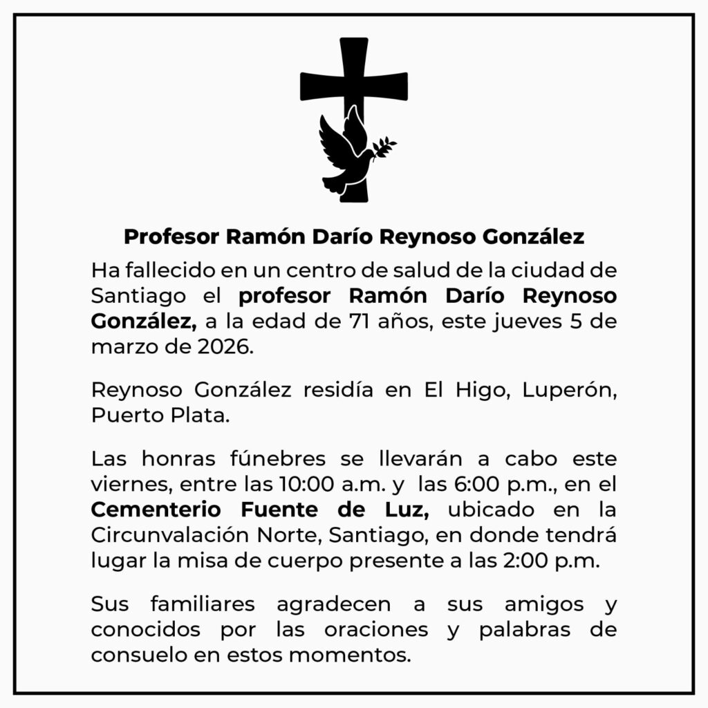 Reynoso González, de 71 años de edad, residía en El Higo, Luperón, Puerto Plata. Sus honras fúnebres se llevarán a cabo entre las 10:00 de la mañana y las 6:00 de la tarde de este viernes, 6 de marzo de 2026, en el Cementerio Fuente de Luz, ubicado en la Circunvalación Norte, Santiago.