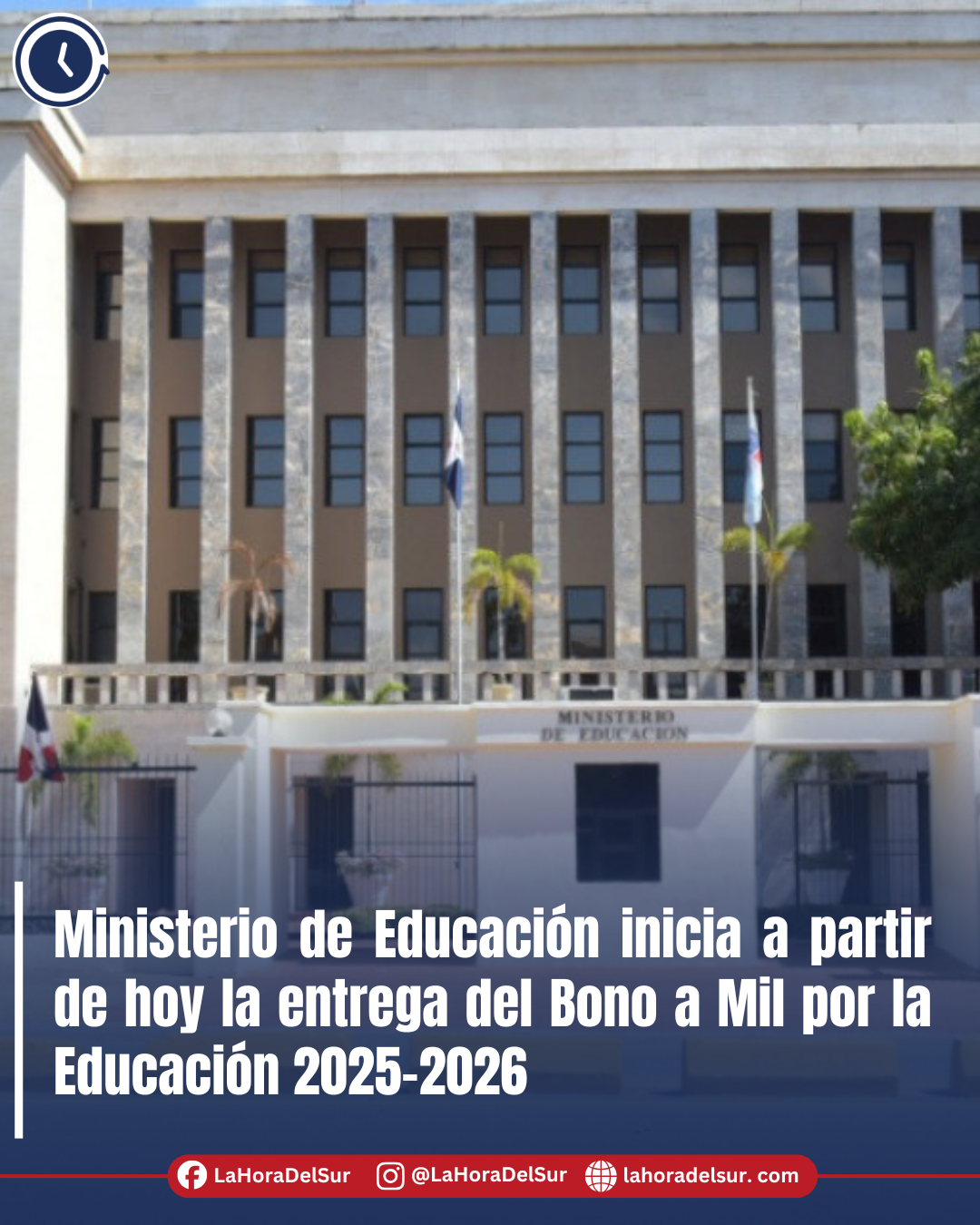 El Ministerio de Educación de la República Dominicana (MINERD) informó que a partir de hoy 28 de enero inicia el desembolso del Bono a Mil por la Educación, correspondiente al año escolar 2025-2026, el cual beneficiará a alrededor de un millón 350 mil estudiantes del sistema educativo público preuniversitario.